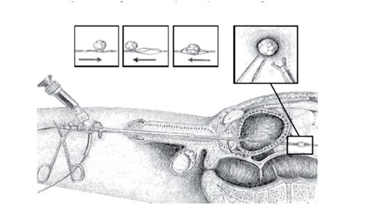 - De uroloog brengt een buisje (ureteroscoop) in via de plasbuis en de blaas tot in de urineleider waar de steen zit.